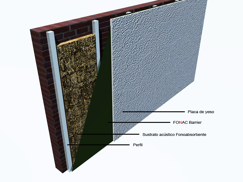 La construcción de tabiquería divisoria entre locales, sea construida en placa de yeso, ladrillo hueco, tableros de madera o de metal, en general carece de la aislación acústica necesaria. La aplicación de FONAC® Barrier brinda una excelente solución, reforzando la aislación en estas particiones acústicamente débiles, disminuyendo la transmisión de los ruidos de un ambiente a otro.